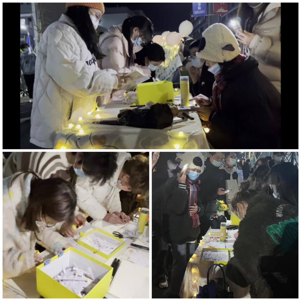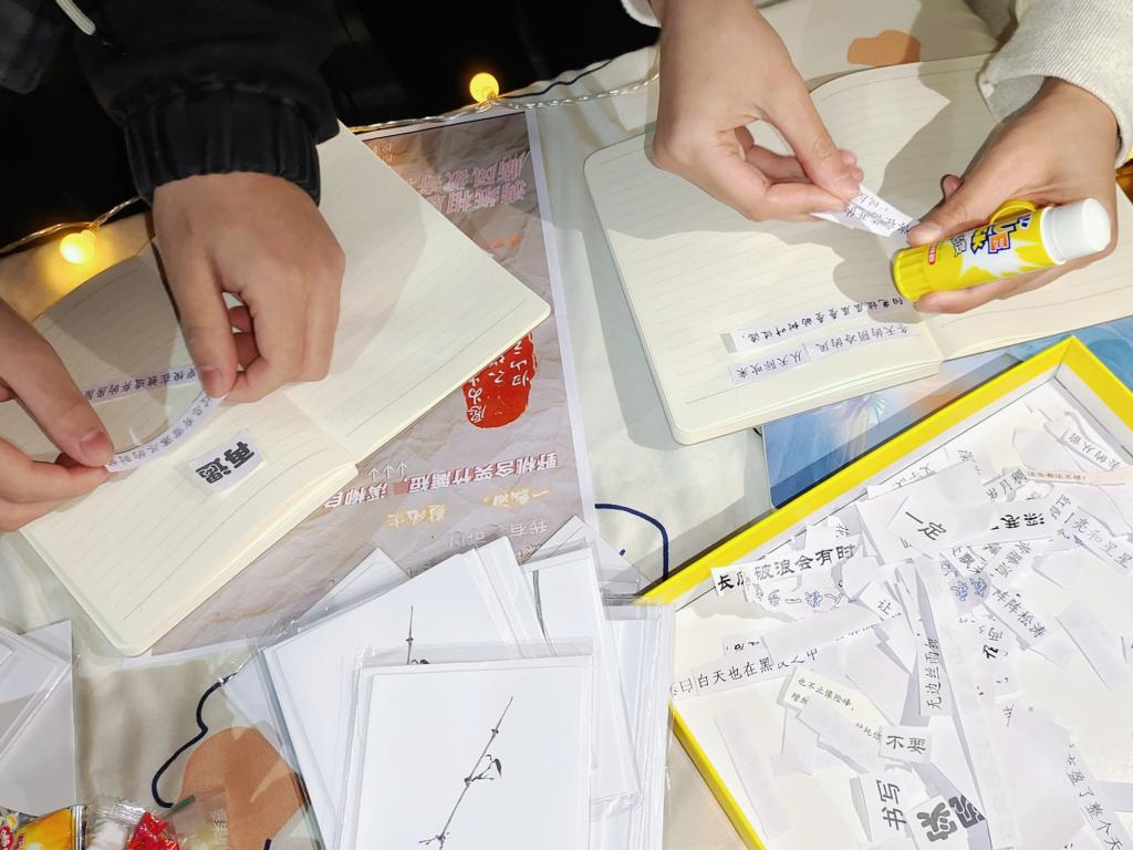 为激发趣味文学创作的灵感和促进新文字类型诗歌的创作,2022年11月30日晚上七点,博雅协会在非日常派对之奇思妙“箱”的社团集市上举办了了名为“诗的飞行日记”拼贴诗的社团活动,将散碎零星的词组成诗句给生活赋予了别样的诗意,吸引了大量师生的参与。