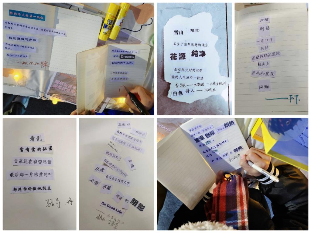 本次活动在同学们的热情与团结中有序进行,来参与的老师和同学们都表示:此次活动让我们发现了意想不到的自己,原来我们都可以依托突发的情感和体验成为“小诗人”,在自己拼接的诗中捕捉脑海中转瞬即逝的诗意流星,这种体验感带来了莫大的满足感、成就感和幸福感。