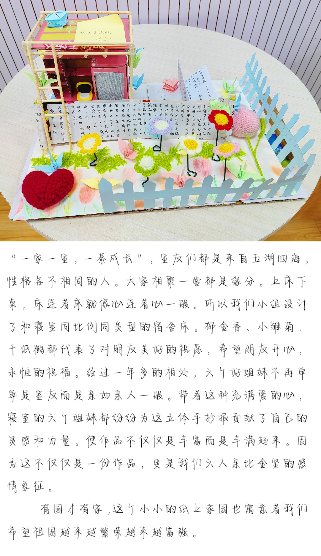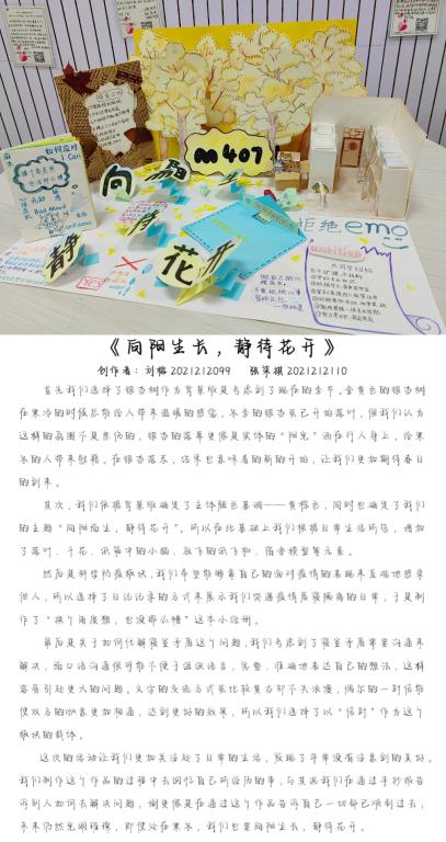 本次活动让宿舍成员学会了互相欣赏、肯定、包容与接纳,有助于创建融洽、和谐、充满活力的寝室氛围,培养了宿舍成员团结协作、以宿舍为家的精神,增强了宿舍成员之间的凝聚力,拉近了彼此间的心理距离,有助于维护良好的宿舍人际关系。艺术与心理的结合,不仅给与我们视觉上美的感受,也营造了积极的心理氛围。綦江校区学生处持续推进我校大学生心理健康教育宣传与活动机制建设,注重在活动中体验、感受,不断增强心理健康教育吸引力和感染力。