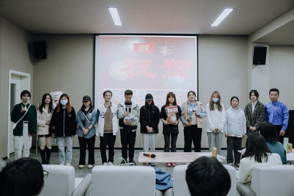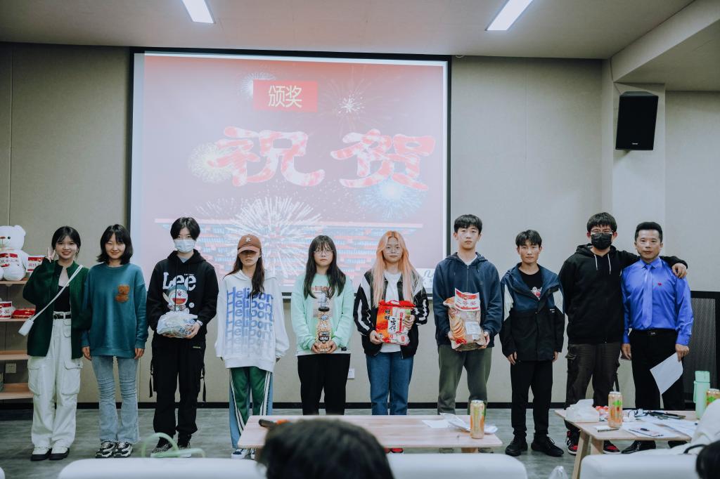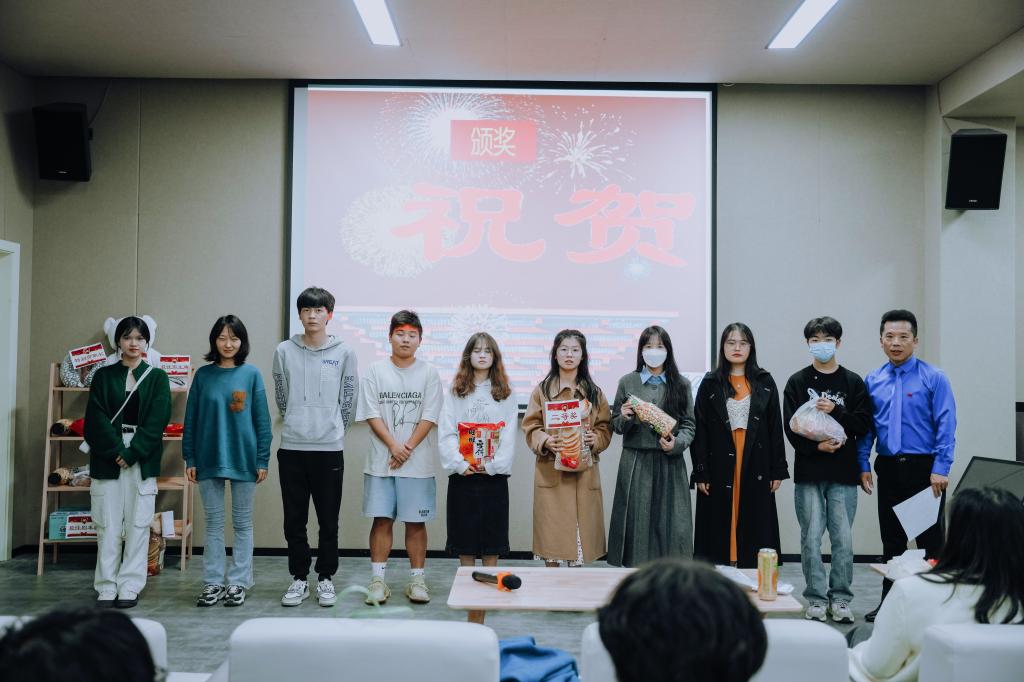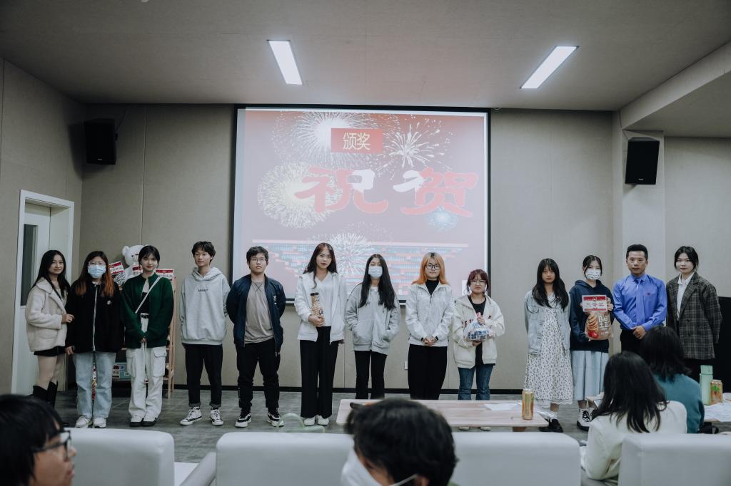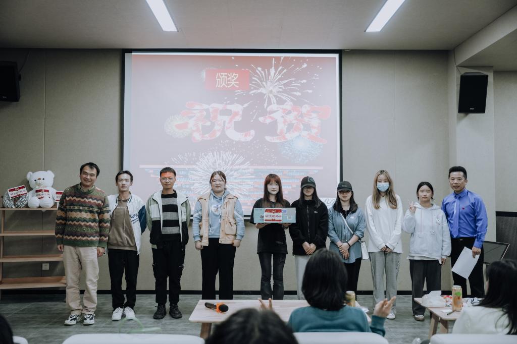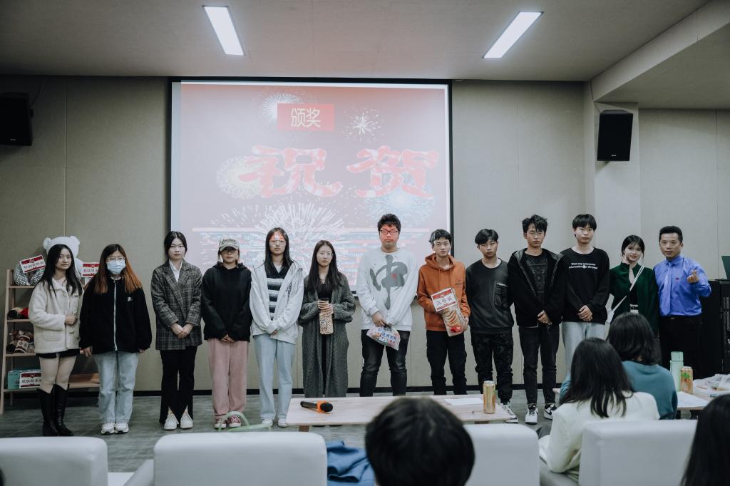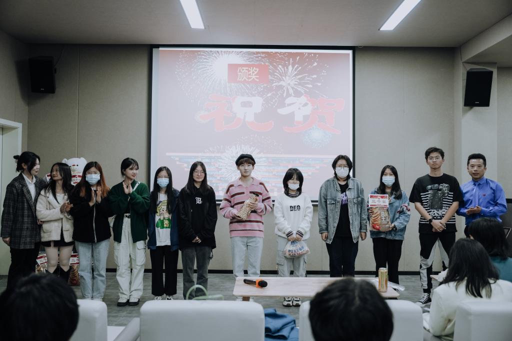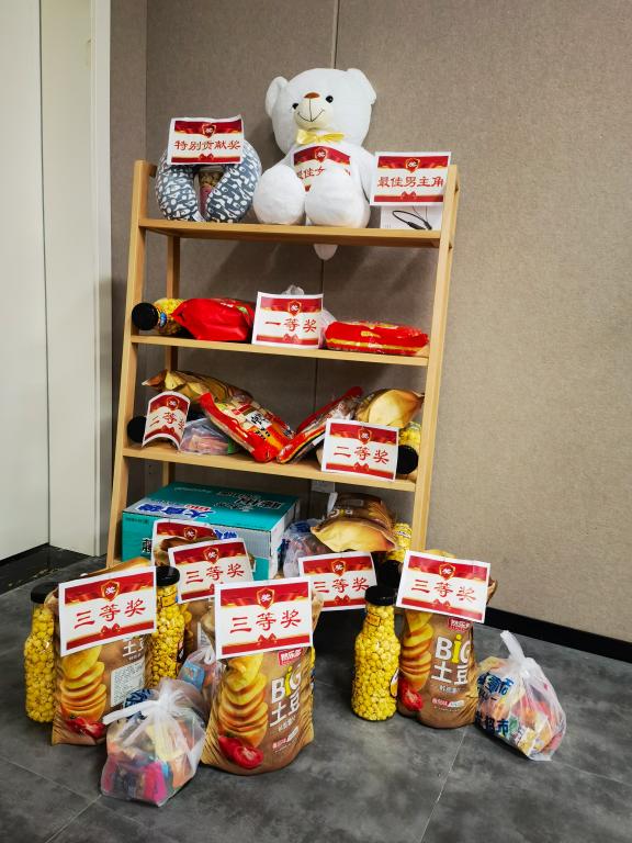 结课汇演上,各种奖品琳琅满目,摆满了货架。8个小组的节目,异彩纷呈。既有视频作品,又有现场演出作品。才华横溢的同学们,在正剧比拼的间隙,又抢着上台表演脱口秀,演唱等,为比赛增添了很多乐趣。其他学院的很多学生,硬生生挤进来观看,显得更加热闹和喜庆,掌声和叫好声一浪盖过一浪。