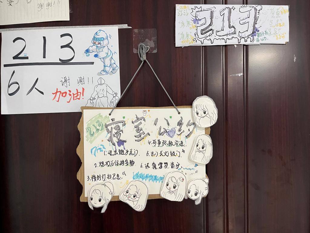 也许生活充满了意外,但213总会用温暖与善良化解。前段时间213的一个女孩不小心摔伤了脚,行动不便,每日一次的核酸成了她最头疼的问题,于是大家各司其职,外出时两位同学当她的拐杖,小心翼翼的扶持尽量减少走路带来的痛苦。在寝室,每人都甘愿做她的“脚”,尽己所能为她减少不必要的运动。在同伴受伤的日子里,宿舍里最常听到的就是“疼吗?”“好点了吗?”“你一个人可以吗?”这样简单温暖的问候。213用笑容驱走病痛,友善让她们变得越来越像一个真正的家。