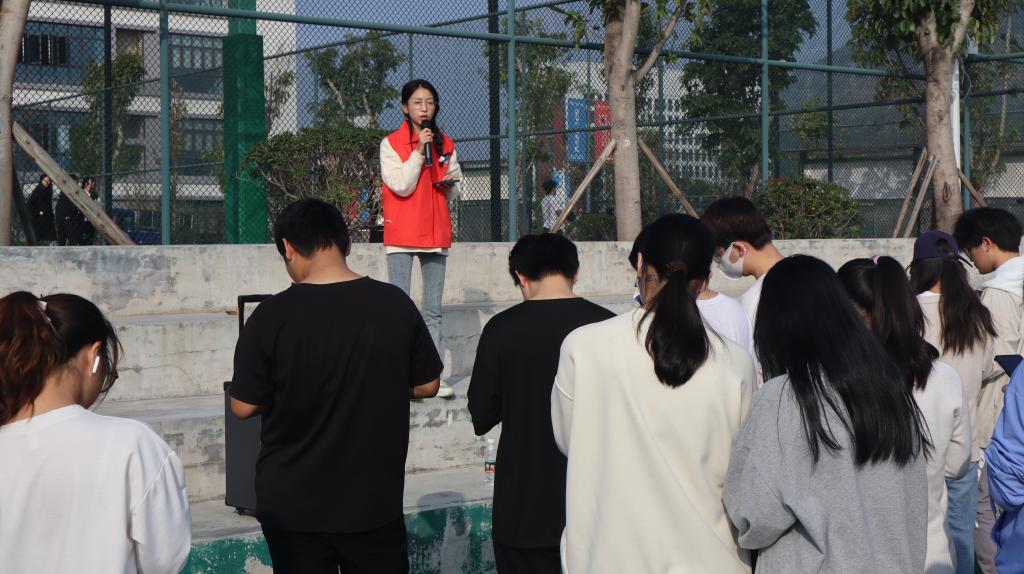 活动正式开始前,学院辅导员李进老师做了动员,讲述了低碳理念国家未来要实现的节能降碳的目标规划,希望同学们用既能强身健体,又有低碳环保的校园环跑,来增强自己低碳环保的意识,来影响和身边的同学低碳的行动。同时,活动有幸邀请到了营地教育中心王欣老师给参赛选手们做公益跑的宣讲和指导,她告诉大家低碳出行的必要性和重要性,并告诉大家环跑的路线和注意事项,并就活动完成要求进行了细致深入的讲解。