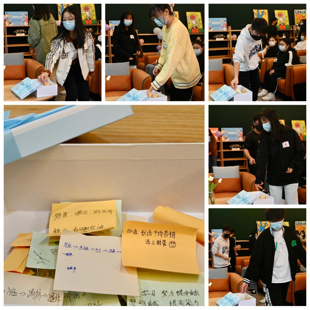 与成功有约,有梦的人终会摘星。“写一写愿景”活动,现场每人手中拿着一张彩纸,用笔写下自己的规划或愿望,所有同学将载有梦想的彩纸有序放入礼品盒中,由辅导员尹金维老师珍藏,在大四毕业后,再把纸条分发到每位同学手上,提醒同学们在追寻梦想的道路,不丢掉心中的罗盘,在面对人生的岔路口,能牢记自己的初心。