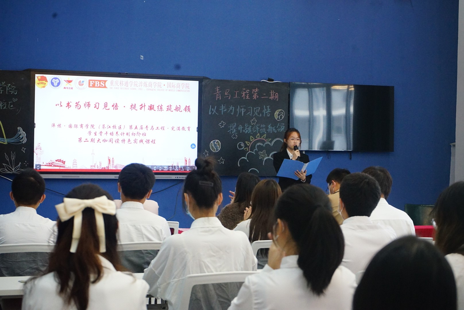 以铜为镜,可以正衣冠;以史为镜,可以知兴替;以人为镜,可以明得失;以书为镜,可以明事理。为积极响应重庆移通学院培养优秀学生骨干的号召,增强青马学员的阅读能力,更好推动学生骨干的统筹能力发展,为商院培养集专业知识和信息产业管理能力为一体的复合型人才,淬炼•国际商学院(綦江校区)于2022年11月25日14:30在智慧教室举行了以“以书为师习见悟•提升凝练筑航领”为主题的第五届青马工程•完满教育学生骨干培养计划(初阶班)第二期大咖阅读特色实践课程。