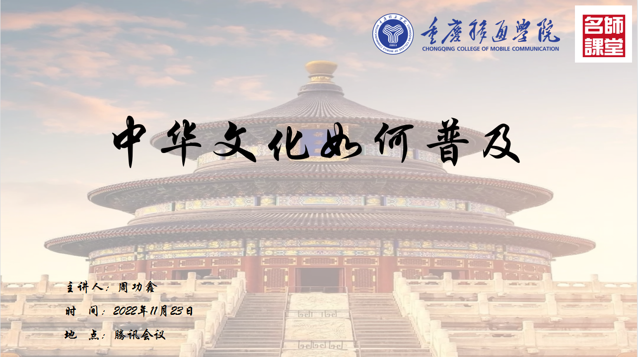 人事有代谢,往来成古今。直至今日,中华文化已有六千多年的历史,文化的获得不是一蹴即成的,它像我们煨汤一样要用慢火和细火,要长期的学习才能丰富内涵。应该怎样让大众接收到优秀的中华文化的内涵呢?11月23日下午4点30 分,文化移通线上研讨会带来了周功鑫教授《中华文化如何普及》的讲座,让师生了解到了中华文化的普及方法。