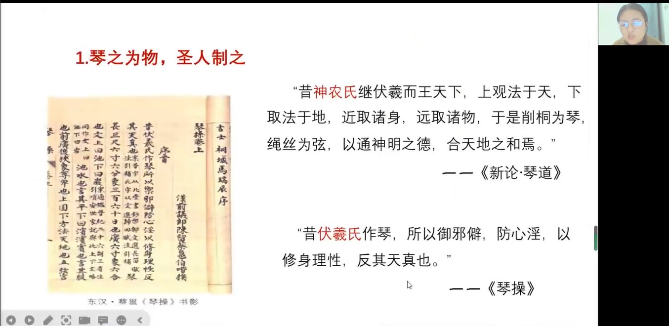 “琴为载道之器,其义大矣哉!”为了在疫情期间陶冶同学们的性情,增加大家对中国传统乐器和传统文化的认识,2022年11月18日晚上七点,博雅协会“綦路致知”系列讲座第二期“古琴与中国传统文化”在腾讯会议开讲。此次讲座由通识教学部冯婷老师主讲,谭堃同学主持,吸引了300余名学生参加。