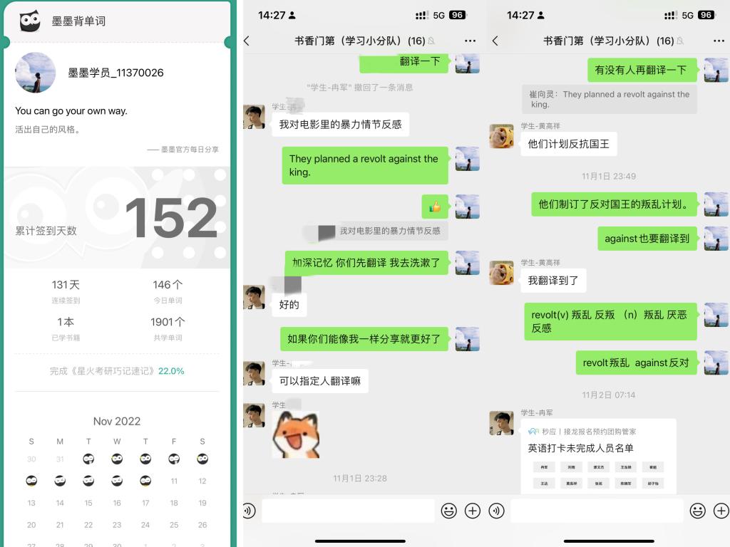 为了帮助同学面对即将到来的四级英语考试,崔老师制定了英语四级学习计划与同学们一起组建了单词打卡小组,崔老师以身作则陪伴同学们每在单词打卡群里分享单词交流学习。每日连续打卡已累计152天,今后将持续进行,直到同学们毕业。这不仅很好的磨练了学生们的自制能力,自我管理能力,有效提升了学生们的学习效率,让学习走进同学们的生活当中,培养健康的学习习惯。