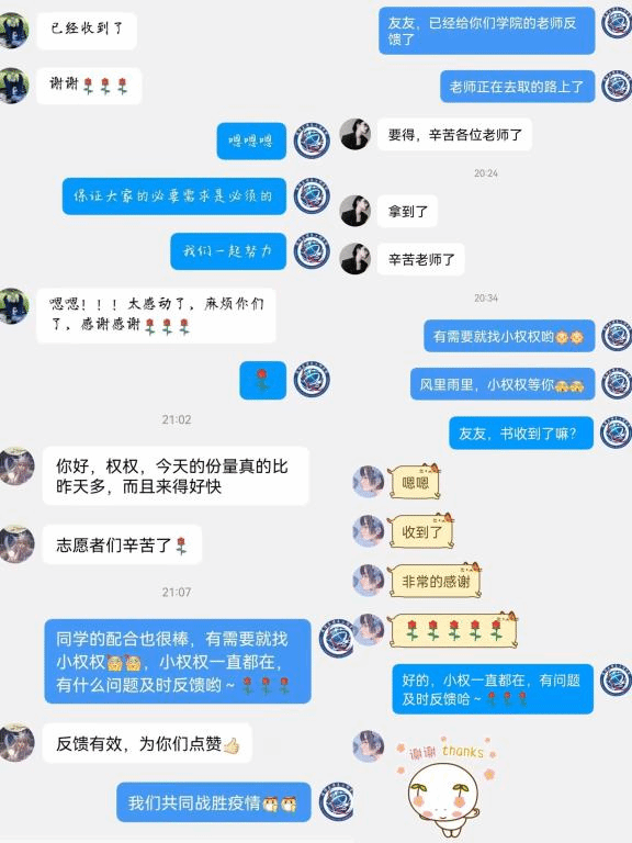 封闭式管理期间同学们无法离寝,不能及时拿回滞留在图书馆的书籍,纷纷向通信小权权发出求助信息。小权权及时将消息反馈至学院,游荟萍老师和周靖鱼老师利用志愿服务工作之余去图书馆为大家取回全部书籍,赶在同学们上课前将书本送到他们手上。