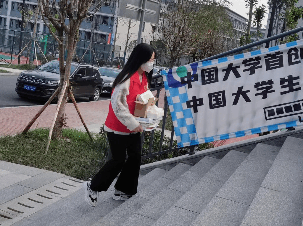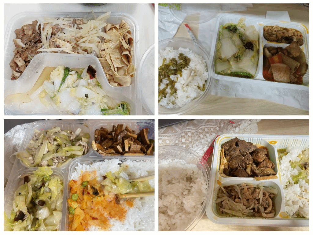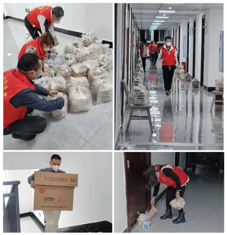 第一天的餐食配送工作尽管匆忙,但一切都有理有条的进行着。以田海燕老师为代表的志愿者老师们一次手拎12份早餐奔走于各楼层与寝室之间,将餐食精准送达至学生寝室门口,轻轻的敲了敲门便离开,沉默地进行着一切。终于,早上9点左右,綦河书院1号楼的同学率先迎来封闭式管理期间的第一份早餐。