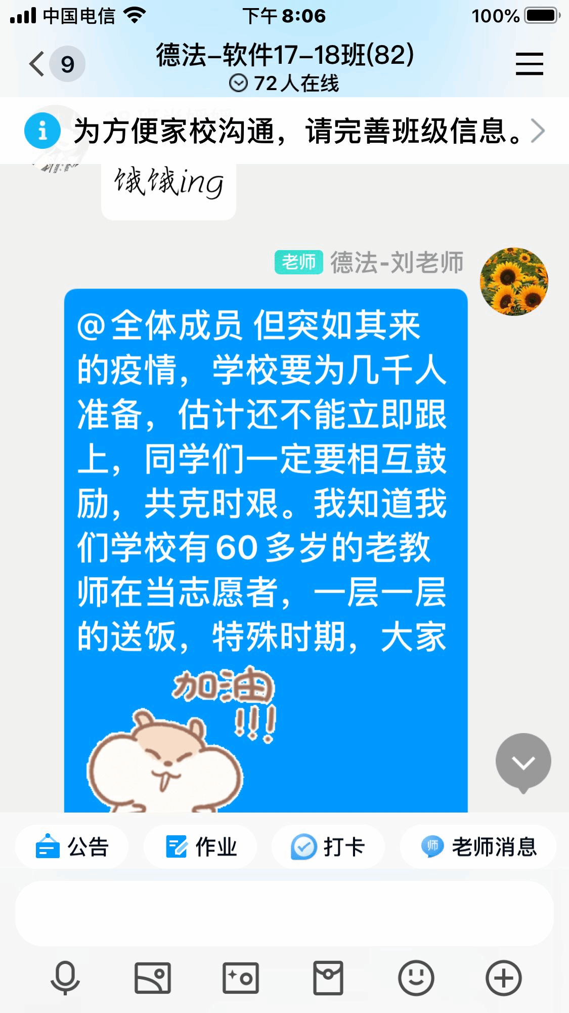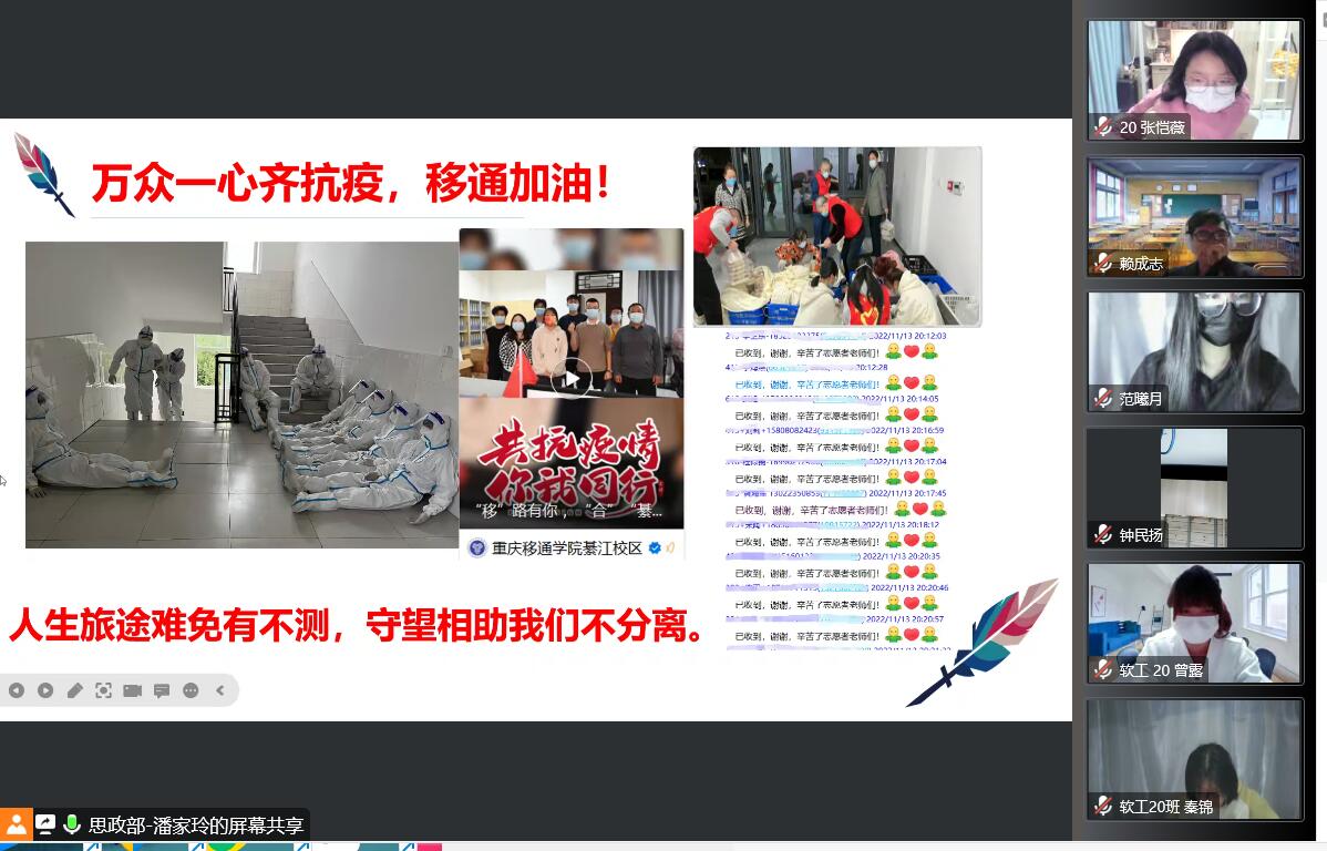疫情带来不可预期的影响,工作的开展更是面临诸多挑战。思政教学组全体教师积极调整工作模式,充分利用网络平台进行教学工作,主动谋划,积极作为,上好线上思政课程。教师们纷纷将疫情与课程内容相结合调整教学内容,发挥思政课程的思想引领作用,守好铸魂育人主阵地。同时,思政教学组人员积极回应学校防疫工作安排,按时做核酸,填写各项疫情防控台账。