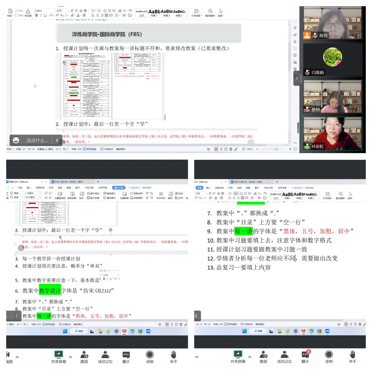叶彩虹老师在边梦柯老师总结的基础上对《概率论与数理统计》课程教学资料互查中发现的问题进行了补充。包括授课计划里学院的称呼应准确,对教案中的字体和标点符号的统一使用做了强调并细致的发现了授课计划中一些标准的官方语句被改动等等。