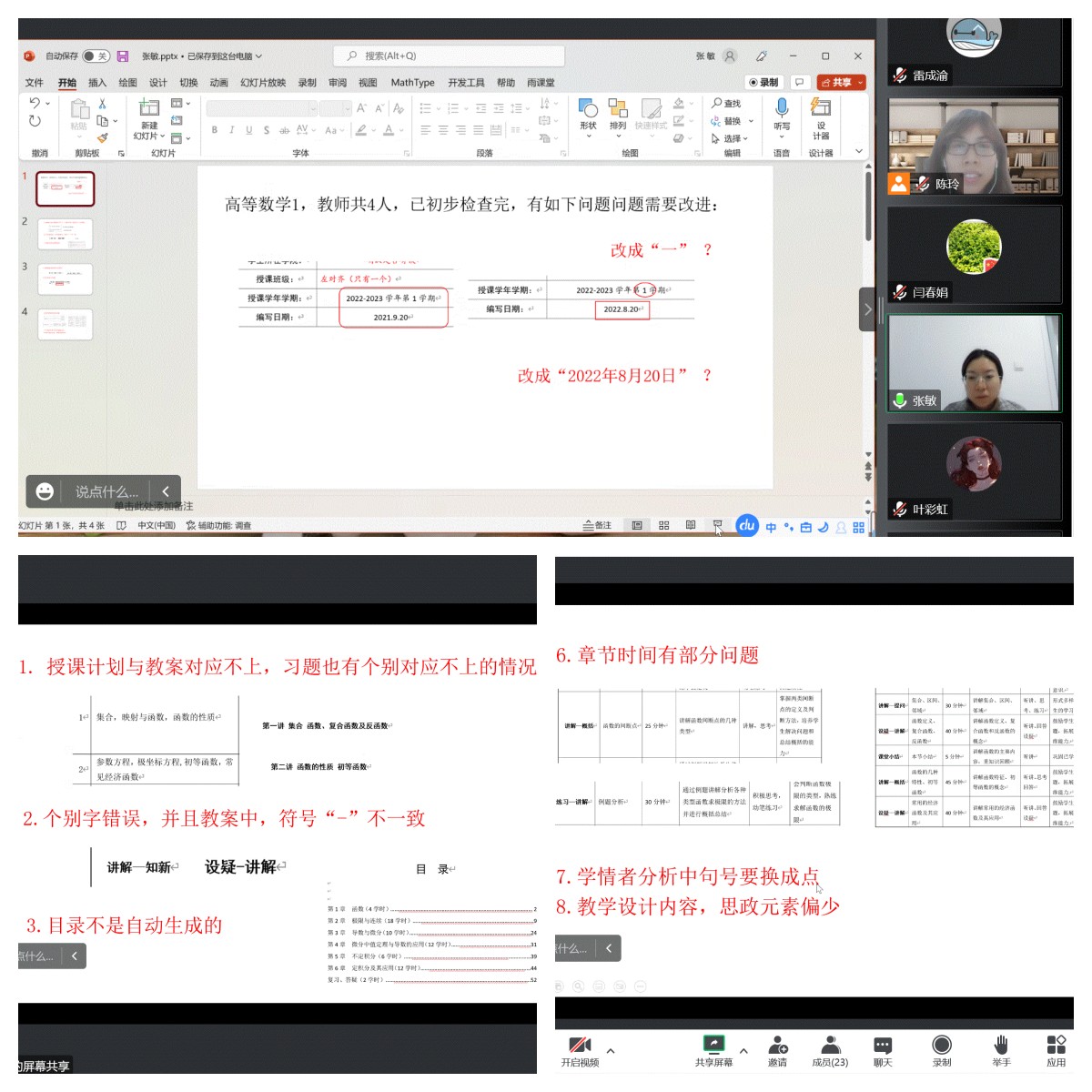 张敏老师在前面两位老师总结的基础上对文科《高等数学1》前期教学资料检查发现的问题做了进一步的补充。特别讨论到几位课程负责人的教案封面出现了两个不一致的模板问题,对于落款的学期日期的填写格式进行了进一步的讨论和交流。