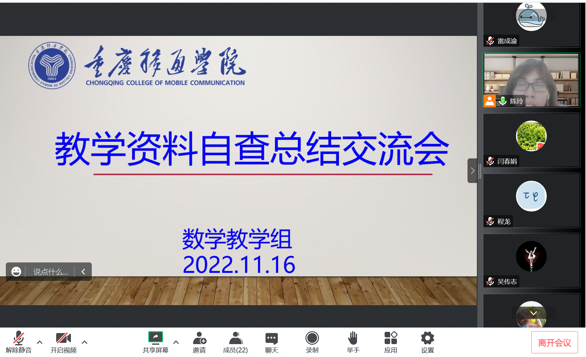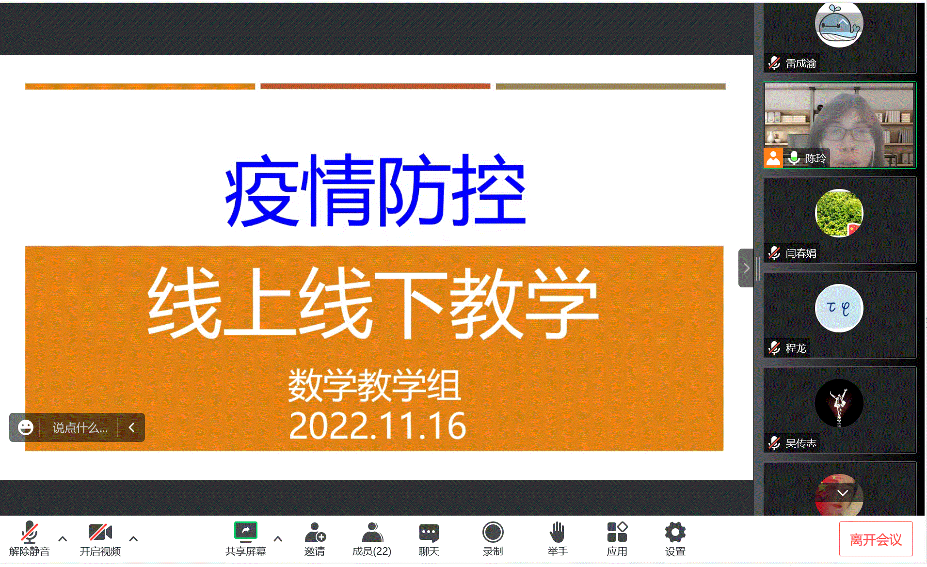 目前,重庆市新冠肺炎疫情形式严峻复杂,疫情防控正处在关键时期,为统筹做好疫情防控、线上线下教学和教学资料自查及整改工作,数学教学组全体教师于11月16日星期三下午16:00-18:00以腾讯会议的方式开展了此次会议,会议由陈玲老师主持。