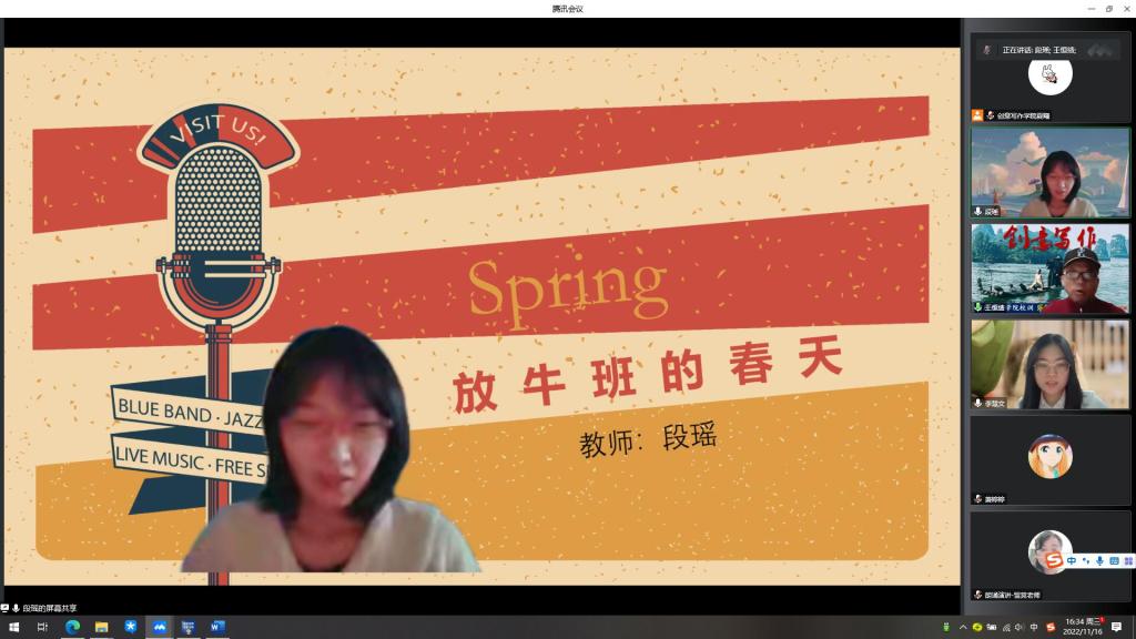 为了进一步提高教学和科研水平,营造良好的学术气氛,创意写作学院于11月16日下午在线上举办了本学期第六次学术讲座——由段瑶老师分享获第77届奥斯卡金像奖最佳外语片提名、又获第62届金球奖电影类最佳外语片提名的电影《放牛班的春天》。创意写作学院全体教师参加了本次线上教研活动。