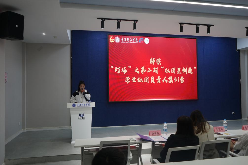 为更好地促进学生社团骨干队伍的发展,并为其提供优质的学习机会和平台,引导社团骨干更高效的发展我校学生社团,加强校园社团文化氛围,学生社团管理中心于11月10日在綦河书院二号楼观涛多功能报告厅开展“灯塔”之第二期“社团星制造”学生社团负责人集训营开营仪式暨理论授课第一课:品牌活动立项。莅临本次会议的嘉宾有瀛洲科幻社指导老师李筱璐老师、綦浪有戏话剧社指导老师潘锐老师、团委各板块指导老师们以及各学生社团负责人。