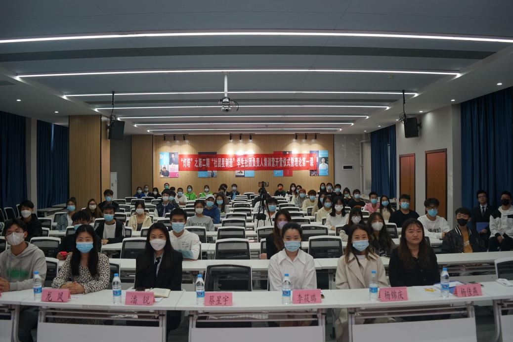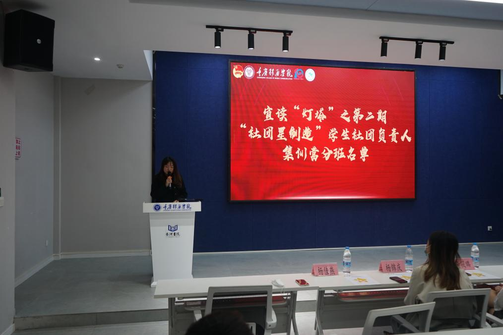 学生社团管理中心工作组代表陈馨怡在现场就“社团星制造”的培养体系、宗旨、培训方式及课程设置作出介绍,并详细解读了培养体系中“2332+”的培养方式,力求用全面与完善的课程体系,在因地制宜的前提下,根据新校区建设实际情况多维度的培养学生社团负责人,使学生社团蓬勃发展,社团精彩全面绽放。此后,社团板块指导老师杨佳燕老师为我们宣读了基础班和进阶班的名单,并对各负责人寄予厚望,希望各位负责人通过在“社团星制造”的培育下,都能有所收获。