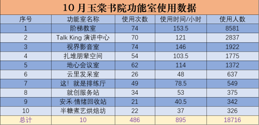 玉棠书院功能室室内总面积约为1500㎡,共有19间功能室,其中10个房间上架指尖移通,可供全校师生线上借用。数据显示,十月线上功能室借用总人次达18716人次,平均每天接待629人次,借用总时长895小时,借用总次数486次,平均每天就要被借用16.2次,其中其他其他组织借用次数最多,为171次。