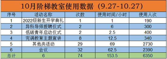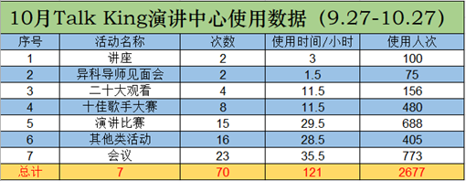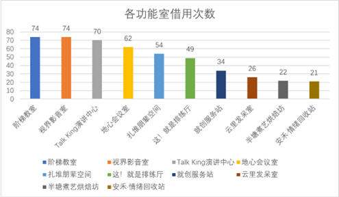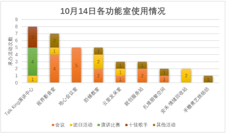 人气最高的要数阶梯教室、Talk King演讲中心、视界影音室,借用次数都在70次以上。特别是在10月14日这一天,功能室累计使用人次达到了1768人次,当天开展了院级十佳歌手决赛、班级团日活动、演讲比赛、异科导师见面会、团建等等,一天里就能体会到各种各样的活动,快来开启你丰富多彩的大学生活吧。