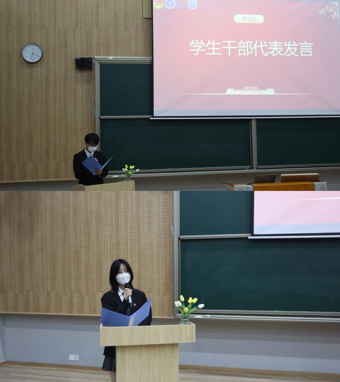 前行路漫漫,立身第一步。学习部部长廖爽同学登台分享了过去一年来的完满经历,从纯“小白”到带领干事们披荆斩棘,她成长了很多、收获了很多,这是完满给予她的变化。同时,青年志愿者协会干事袁锡同学也上台进行了发言,为我们阐明了如何修身立身,对待部门工作要有责任之心,放平心态,积极参与配合部门各项工作,也应当具备越是艰险越向前的精神。