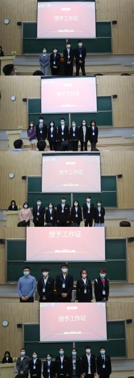 合川校区的大三的学长学姐们,发来祝福和期望视频,全体成员观看了学长学姐们的完满风采,备受鼓舞。常言道:“不想当将军的士兵不是好士兵。”也正是这种向往之心提高自身组织建设能力和水平,从而形成一种有利循环,促使学生组织部门趋于完善。过后,各位指导老师为部门干部授予并佩戴工作证及合影留恋,这也是为学生干部带上象征着使命任务的标志,激励着各学生组织成员不断严格要求自身。