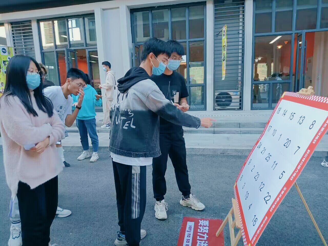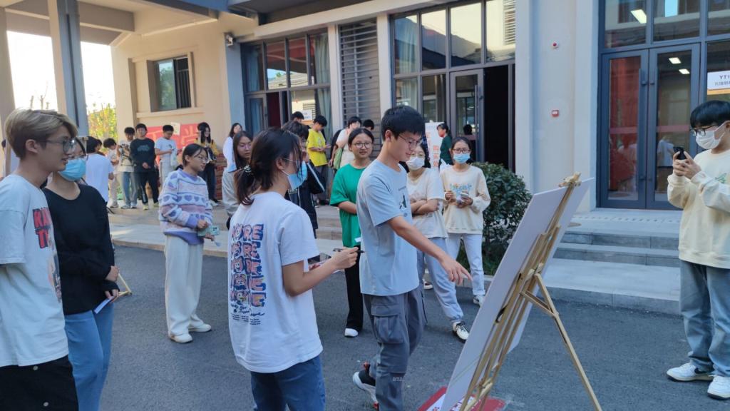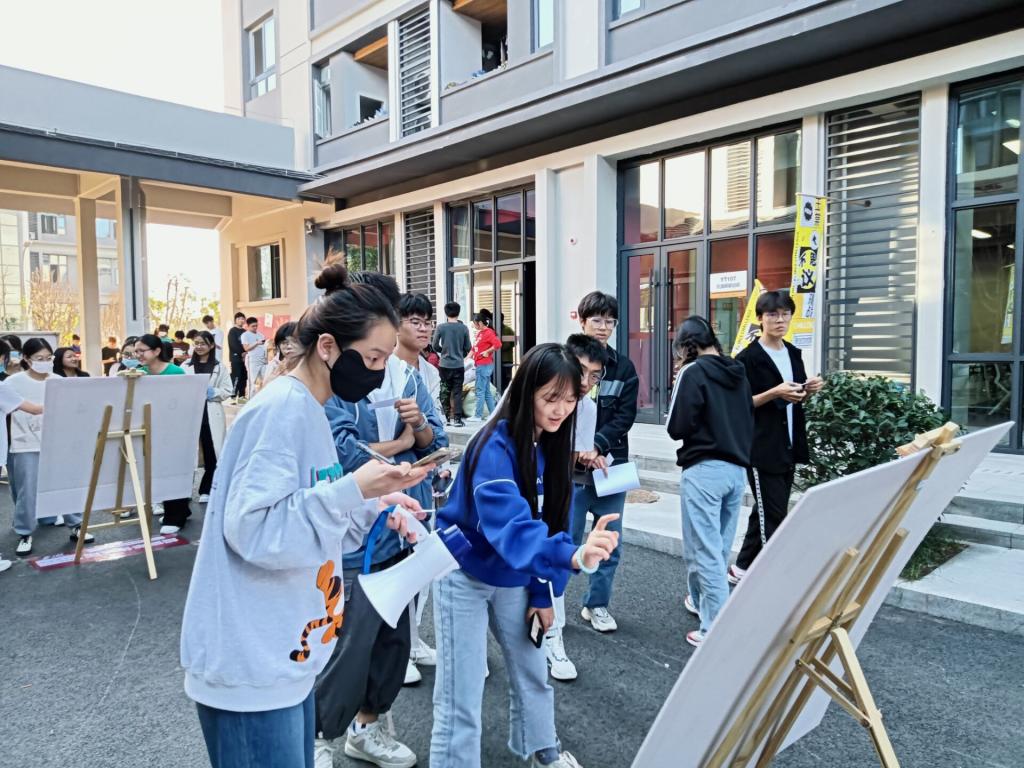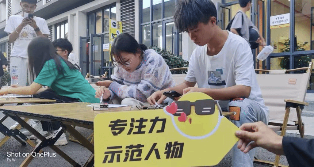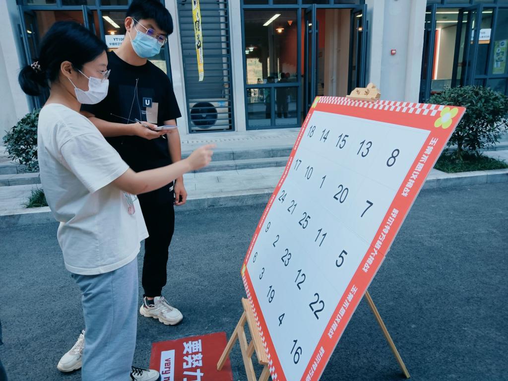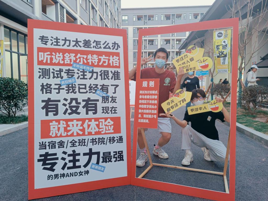 在第一关卡中,由易至难的方格有序的排列在玉棠巷,超简单体验版让同学们了解规则,高阶版让同学们渐入佳境,困难版则让同学们“陷入”寻找,随着活动的开始,越来越多的同学们开始聚集在现场,参与者眼疾手快,在各种格子间不断跳跃,观众们也跃跃欲试,拿出手机自行计时。随着现场人数越来越多,各种声音接踵而来,如何在嘈杂的挑战环境中快速沉浸于专注成了同学们制胜的法宝,也凸显出专注力程度不同在挑战中成绩的差异。