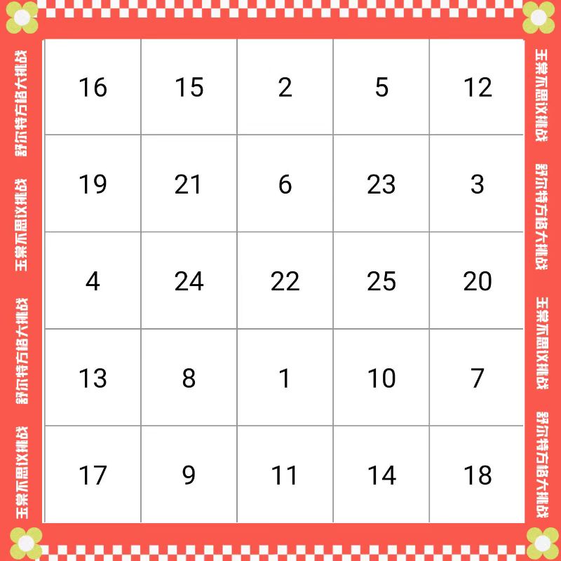 舒尔特方格作为飞行员检验专注力的工具,是目前世界范围内较为简单有效,也是科学的专注力测试方法,以“5x5”方格为例,将1至25的数字顺序打乱,填在5x5表格里,用最快的速度从1数到25,时间越短专注力水平越高。两期活动借助舒尔特方格开展活动,以此提升学子专注力自检的基础能力。