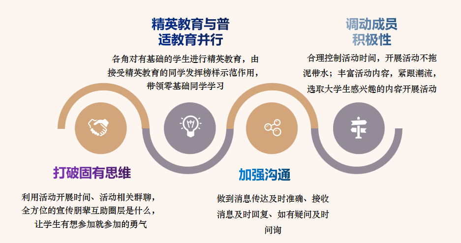 綦河书院依托家文化和领导力双核驱动实现实践育人、文化育人、服务育人的质量提升,在发展导师+专业导师的陪伴和共享下,构建“1+”对话机制,为学生创造社区共享与朋辈互助的新圈层,构建扁平化互助式的朋辈互助格局蒸蒸日上,学子技能共享实现指日可待。
