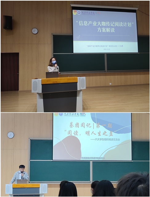 合川校团委开展“致敬大咖,传记共读”校级学生组织大咖阅读分享会。活动旨在让学生干部们通过阅读大咖书籍丰富自身知识储备,并把书中的方法与技巧应用到实践中。綦江校团委面向六大校级学生组织在玉堂书院阶梯教室开展“綦团阅记|第一期‘阅读·明人生之盏’六大校级学生组织阅读交流会”。邀请马慈老师做方案深度解读,各校级学生组织对我校“信息产业大咖传记阅读计划”有了更新、更清楚、更深的认识。
