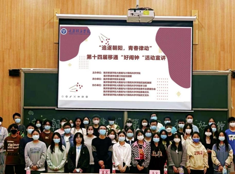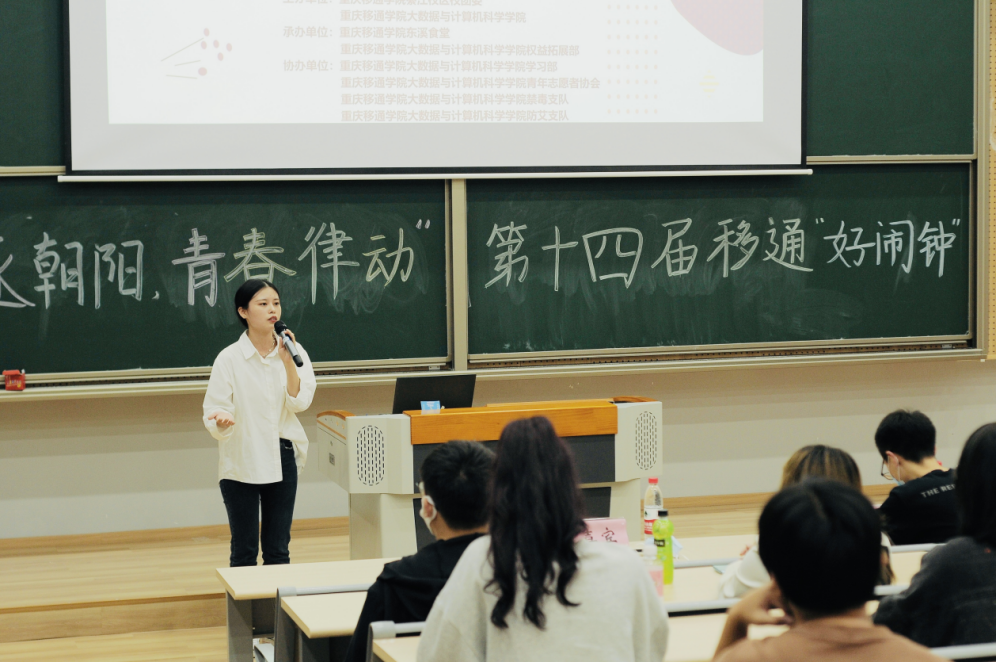一年之计在于春,一日之计在于晨。早晨,是一天中最重要也最美好的时光。它划破漫长黑夜,带来黎明的破晓,白驹过隙,忽然而已。大学生们将唤醒沉睡中的自己,向美好的朝阳说声“你好,我的时光”。重庆移通学院綦江校区各学院权益部部长、干事于11月2日19:00在横山阶梯教室参加由大数据与计算机科学学院学生会权益拓展部主办的“追逐朝阳,青春律动”——第十四届移通“好闹钟”活动宣讲。本次宣讲会特别邀请大数据与算机科学学院志愿服务指导老师李进、社团活动指导老师蔡娜共同参与。