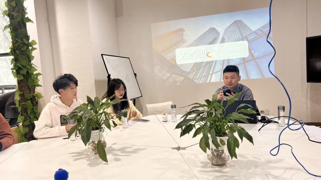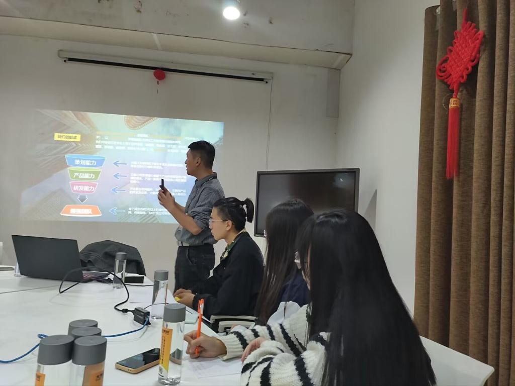 随后,丁元彬总经理在公司中庭同綦河书院资源拓展部的学生们开展了交流会。会议中,丁总为我们详细介绍了大綦网络的基本情况和营运模式,以及自己对创业就业管理方面的认识。同时也对赞助拉取、活动宣传、市场选择方面等进行讲解,同学们全神贯注,认真思考,构思着属于自己的创业道路,响应了我校信息产业商学院的特色办学模式,助推了同学们的商才道路。