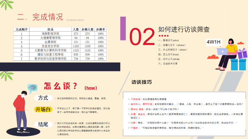 研讨会上,张纯霞老师从教育部相关文件精神中引入心理健康的重要性,强调心理普查对增强新生心理健康意识,促进自我认知有着重要作用;并结合2022级学生心理普查结果反馈、如何开展访谈筛查、危机预防与干预等三个方面的内容展开具体分享。她表示,2022级学生心理健康状况结果总体良好,只有个别“高关怀”学生需要与辅导员老师们合力进行心理干预工作;围绕“高关怀”学生如何开展访谈,张老师提出“4H1W”的原则,详细展开说明访谈时需要注意关注学生既往史、成长史、症状发展史、风险评估等内容关键点,强调“觉察学生有自伤自杀风险时,可以坦诚地与学生进行沟通,真挚的关心可以有效地预防危机情况的发生”;觉察学生“异常”情况时,可以从生理、认识、行为、情绪方面上入手,结合社会功能的影响程度、持续时间、情绪是否泛化等指标综合评估学生心理问题等级,并根据问题严重程度作出相应的处理。