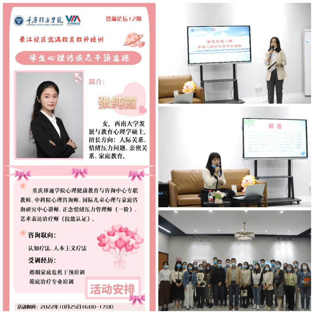 编者按:为加强綦江校区完满教育教师队伍建设,提高完满团队的职业认同感、归属感和方向感,将理论知识有效运用于实践工作中,让学生工作更科学、更有成效。綦江校区结合工作实际,打造登瀛论坛系列培训。围绕“榜样引领、理实结合、任务驱动、成果导向”,通过朋辈互助、专家指导、自我实践,让参训教师在做中学、学中研、研中创不断提高理论水平、业务技能和工作实效。培训分完满故事、读书分享、专题讲座、研讨交流、学习考察、团建活动、课题研究等版块,采用线上线下结合、分层分类分阶段的模式开展。