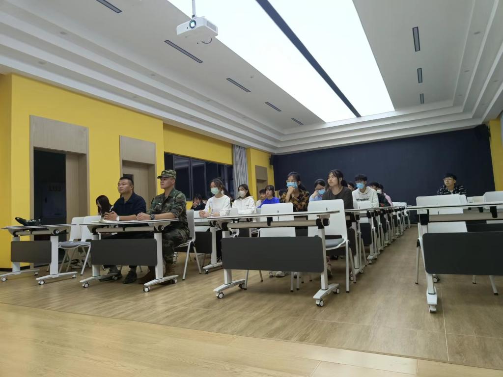 本次见面会特邀退役复学的徐新智教官作为分享对象对新队友分享经验。徐教官步伐沉稳,面庞坚毅黝黑,双目炯炯有神。徐教官的迷彩服为活动现场营造出了一种肃穆的气氛,迅速有力的敬礼,抬手时的余音回响会场。