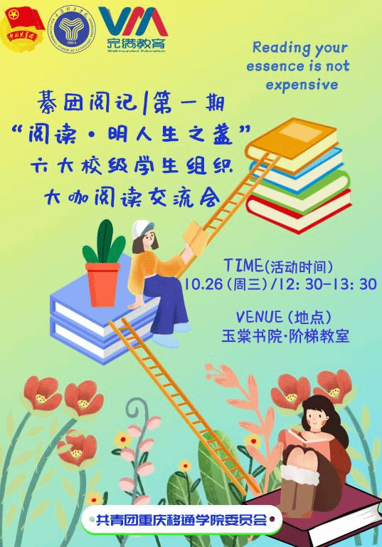 本次綦记阅团|第一期:“阅读·明人生之盏”六大校级学生组织大咖阅读交流会在同学们丰收的喜悦中结束。虽说结束但也是开始,生命一天天在阅读的濡染中,会变得愈加醇厚耐品,一种灵魂的香味,自然就会生发出来,飘逸四散。