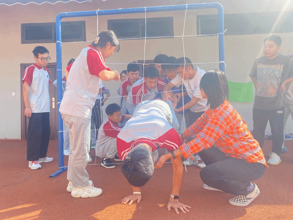 课程的最后,两名同学自愿出列为全队的队长,咬牙坚持为其他同学提供人梯支撑,白色T恤上深浅不一的脚印,背上手上的红肿,让四支队伍的同学们再一次团结一致,共同完成“越障”这个结项项目。从脸上滑落的汗水,早已浸湿的白衫,无不彰显着同学们勇于奉献,团结合作的精神。
