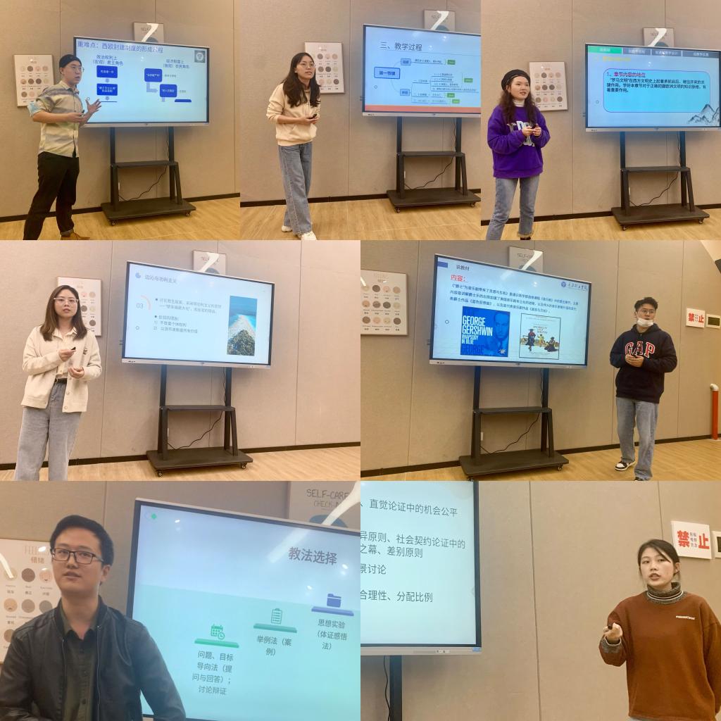 比赛按抽签的顺序,各位老师依次进行说课和公开课展示。第一位参赛的是付忠明老师,对《世界三大文明》课程进行讲授。申雯心老师选取“如何理解言论自由”的话题。胥云龙老师向我们展示“西欧中世纪早期匈人西迁的原因、过程以及影响”等内容。骆宇老师主要呈现“仁的内涵”这一部分的内容。冉巍老师展示“罗马共和国到罗马帝国的政治制度发展情况”的教学内容。刁碧荣老师选取“社会契约的内涵以及形成要素”等内容进行讲授。蒋佳俊老师以“高考”这一话题为主要的讲授内容进行课程展示。同样教授《正义论》课程的米星羽老师则选择了“无知之幕”作为主要的讲解内容,谭松林老师为我们展示了“流行音乐和古典音乐的区别”。