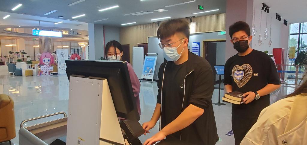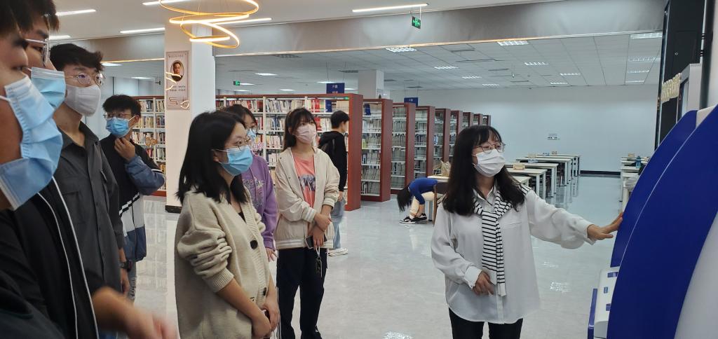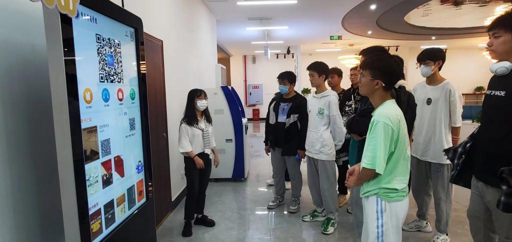 2022年10月23日上午9点,各位萌新在学院各新生辅导员的带领下分批错峰来到图书馆,刘文文老师为同学们讲述了如何进行借阅图书馆的书籍、带同学们体验了VR图书。除了馆藏纸质图书,图书馆还有各种获得电子图书的方法,这正是图书馆一楼那几个庞然大“物”的用处,例如图书馆一楼的电子书瀑布流,不仅为同学们带来视觉上的美感,还可随时随地随心进行阅读,这真是手机一族的福利。