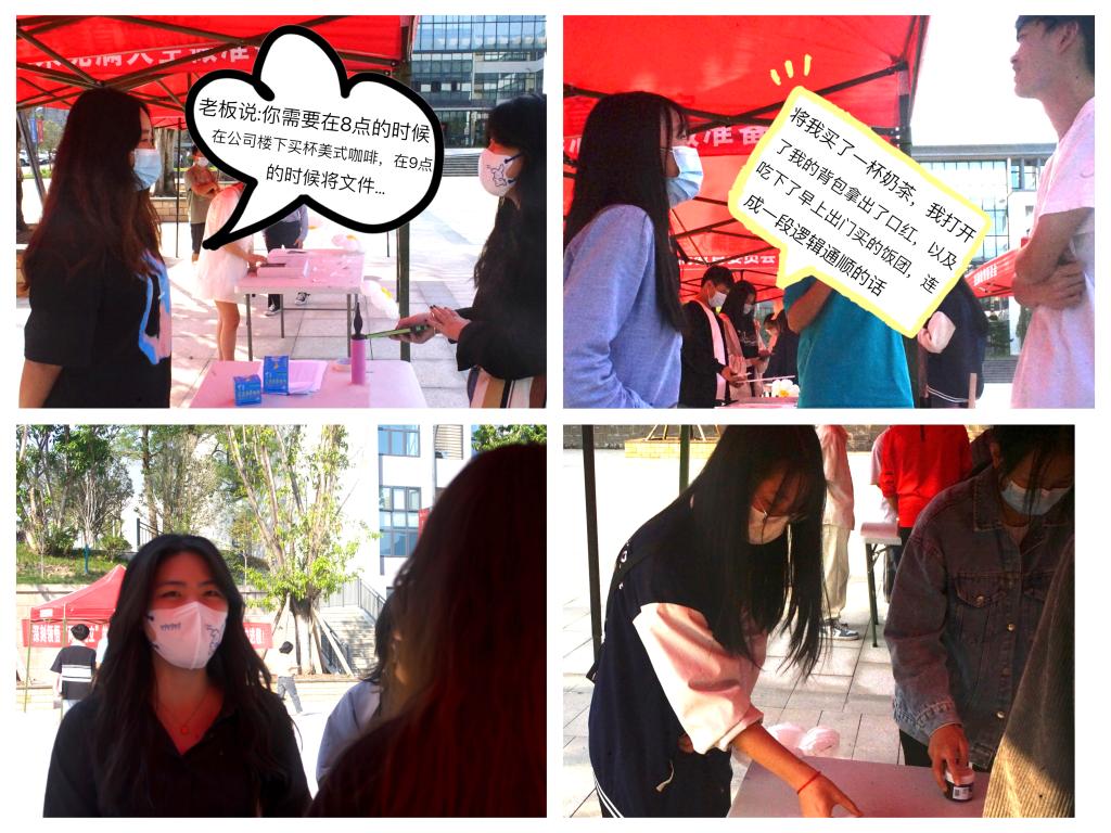 冒险型职业旅程:为提升同学们的工作处理能力,第一关设计了临场反应关卡,同学们需要从“老板”发布的命令中把握到需要完成的任务,并给出解决方案,以此考验同学们的临场反应能力;第二关是逻辑梳理关卡,同学们整合5句不同的句子并复述成一段话,从而提高自身的逻辑思维能力;第三关是专注力考验关卡,2人一组,组组PK,同学们通过翻转杯子,让棋格子中央的物品朝对面前进,先到达对面的那一组获胜,此关卡让大家明白专注力在职场中的重要性。