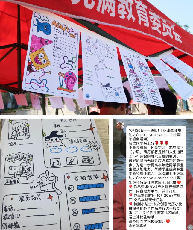 萌芽生涯意识——简历。简历是个人的推荐信、说明书,更是面试官了解自身的重要名片,需要用学历、实践经验、个人荣誉去添色加彩,包含对自身职业素养的充分分析以及对未来的愿景。年级会前期,辅导员提醒同学们思考自己未来的方向和职业生涯规划,并尝试去制作一份简历,这不仅能展现同学们对未来职业的憧憬,更能唤醒学生的生涯意识,点燃学生。