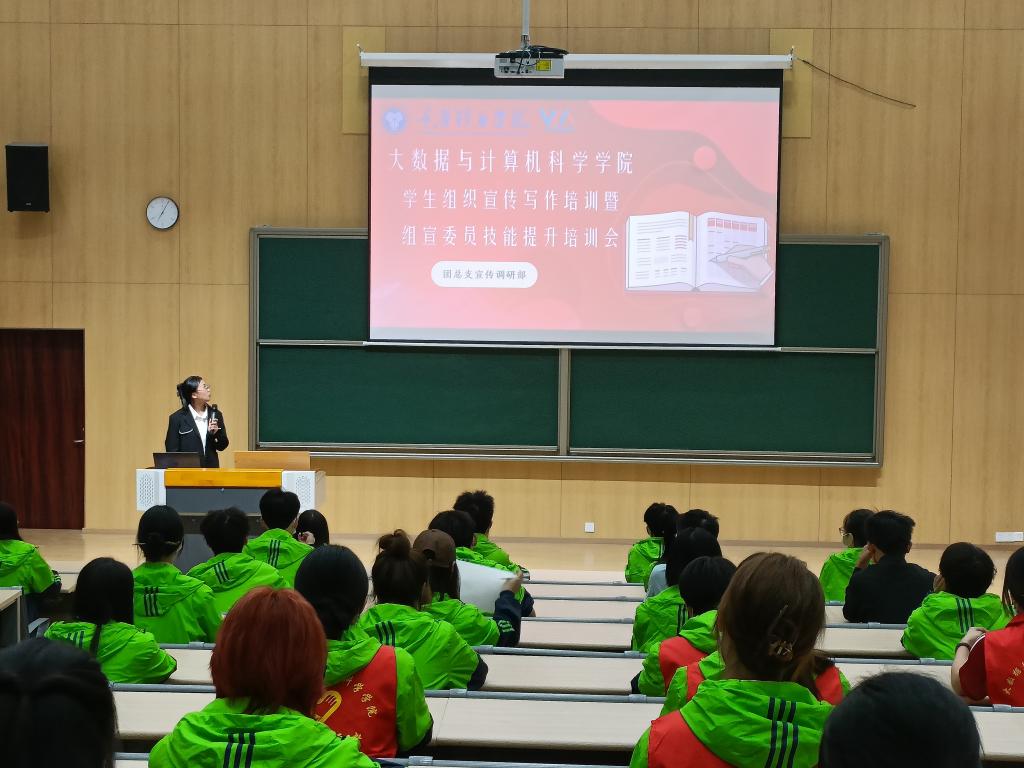 完满的风采呈现离不开新闻宣传的辅助,新闻是唱响完满声音的重要途径,为拓展和延伸同学们的宣传能力,更深入更有效地绽放完满的风采,10月23日晚19点,大数据与计算机科学学院团总支宣传调研部在玉棠书院阶梯教室组织了一场新闻宣传的业务培训会,全院2022级各班级组宣委员、团总支学生会组织部门部长干事共60余名同学参加了培训。