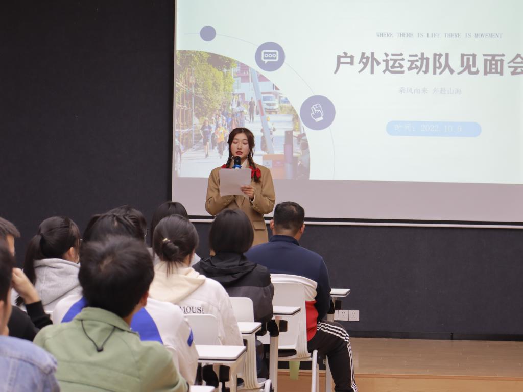 见面会开始前,同学们一同观看了户外运动队和户外社上学期举办和开展的与户外相关的活动视频。见面会在主持人秦如意也是户外运动队队长的致辞中拉开序幕,她首先对新生们表示热烈的欢迎,同时向大家介绍户外运动队和户外项目,让新生对户外运动队有了简单的了解。