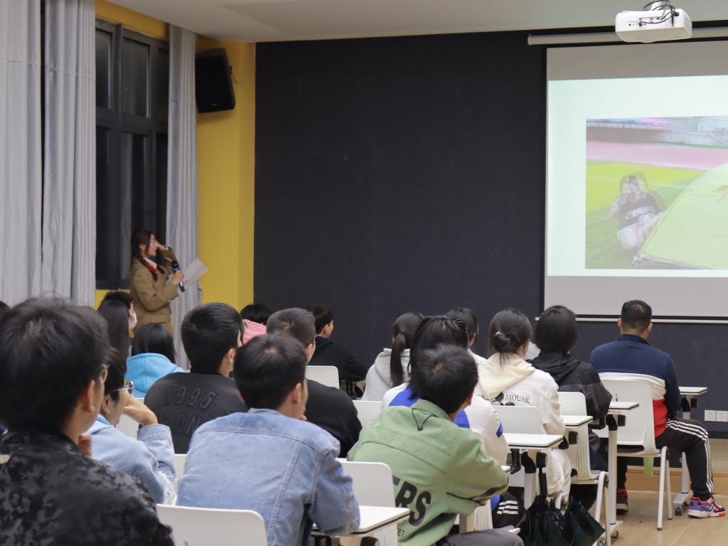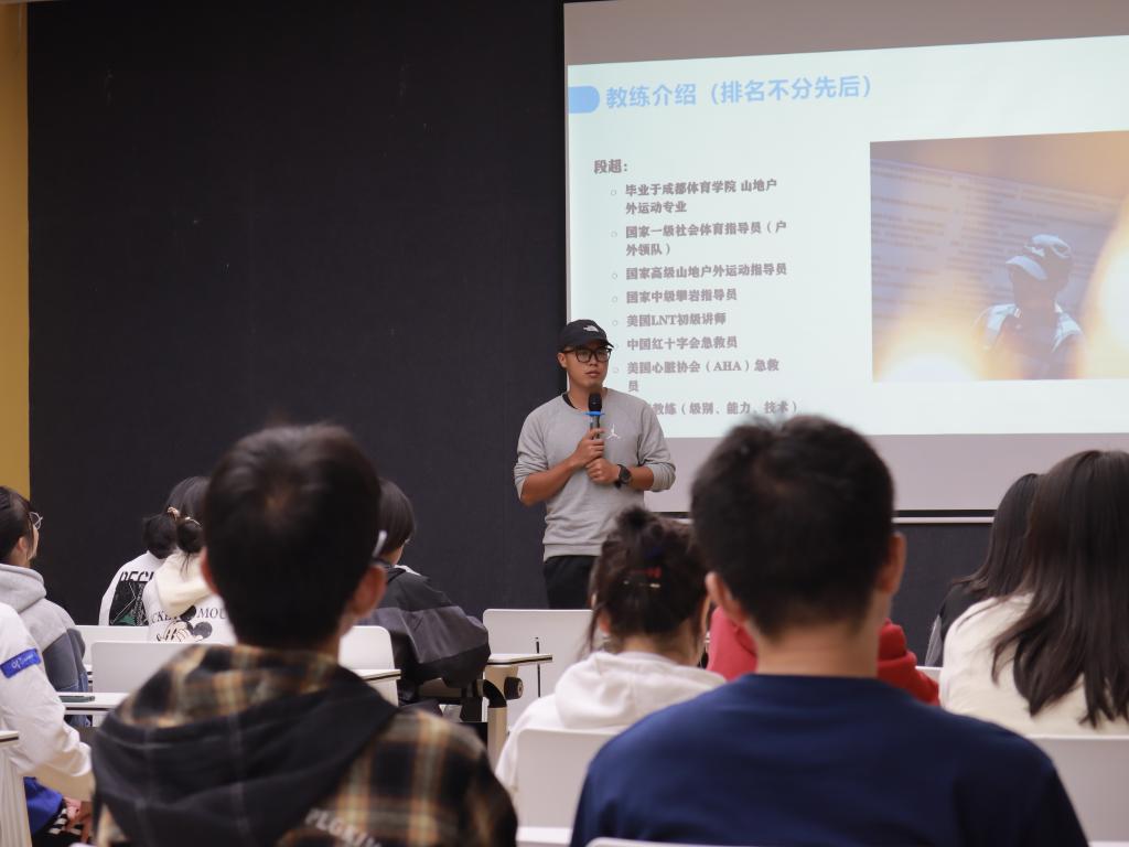 户外运动队成员也是户外社社长郭小荣向新生分享自己在户外运动队的成长经历,也对户外社团与户外运动队的区分进行了详细的介绍,向大家介绍户外社团在上学期举办的活动和在本学期社团活动计划。