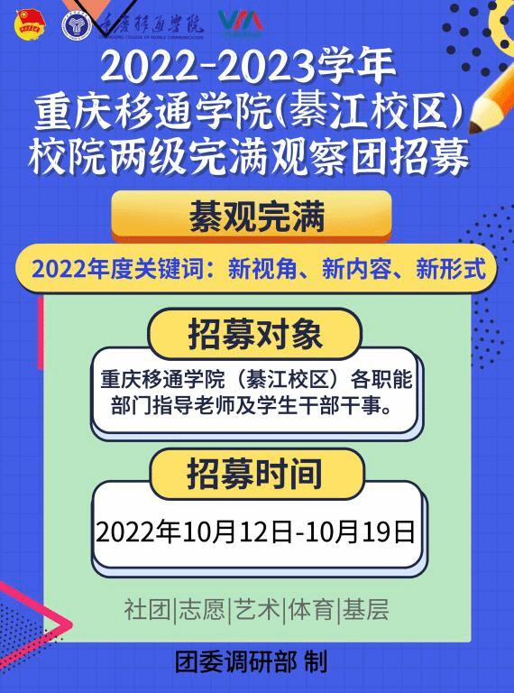 针对这些疑惑,团委调研部将为你全方位解读什么是完满观察团,本学年相关工作的开展措施,帮助你走入我们的世界,看完这篇攻略即使零基础也可以上手完满观察团工作,綦观完满,我们等你行动~