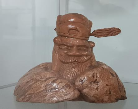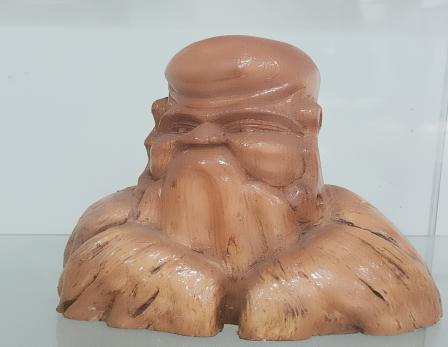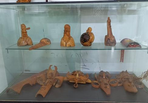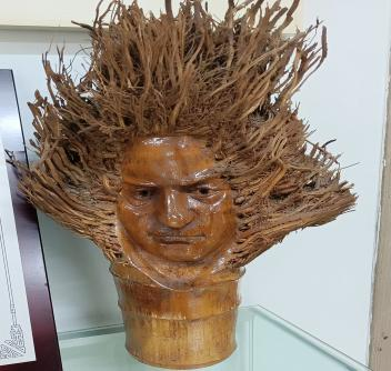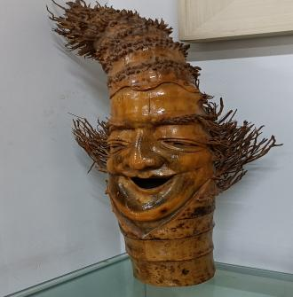 在綦江区文化馆工作人员的带领下,我们到了7楼的非遗展厅和非遗办公室。进入展厅,我们被陈列的展品所吸引,惊奇地观赏这些艺术品。展品大多是用竹笋雕刻的人物雕像,竹笋繁茂的根须是雕像的鬓发,再加上夸张的面部表情,雕像的表现力很强,也有憨态可掬的土地公。