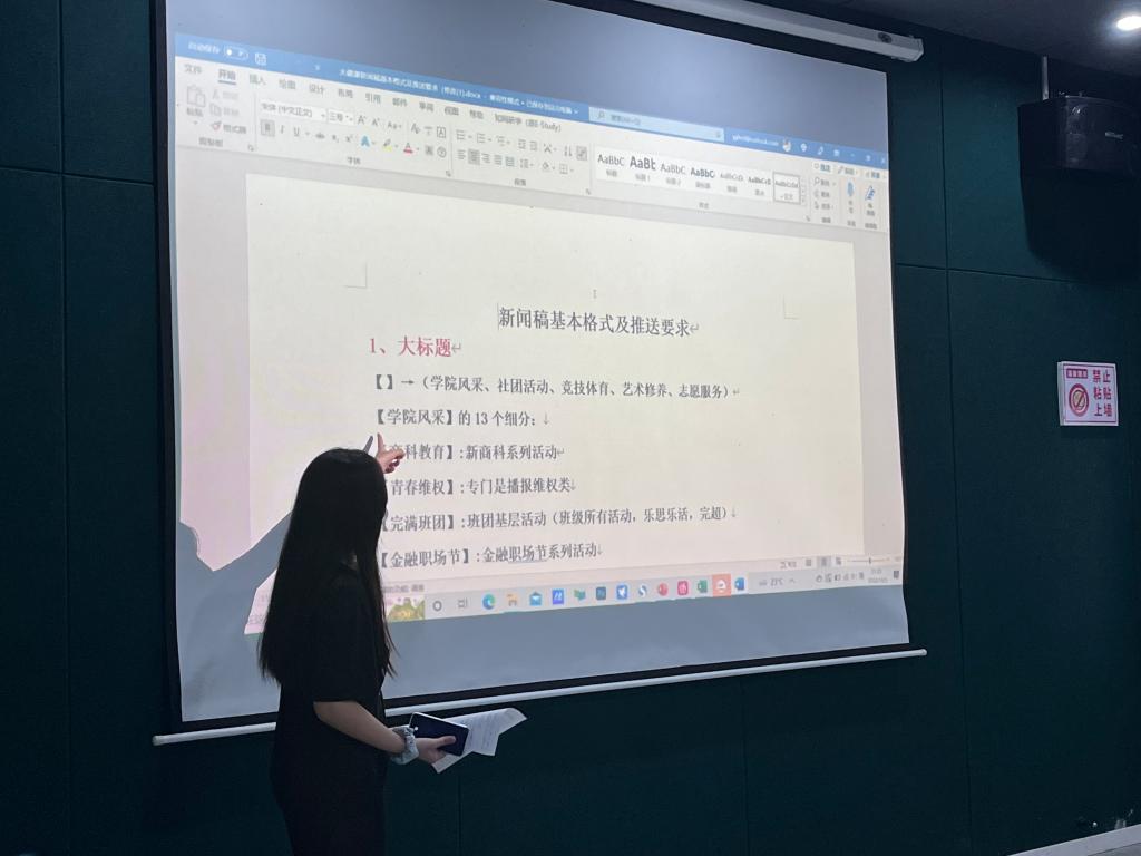 紧接着班导师王瑜为同学简单讲解了日常新闻稿的格式。一篇好的新闻稿离不开让人赏心悦目的格式,班导师王瑜着重强调了文段对齐问题和文段行间距问题。最后同学们在电脑上进行自我操作,复盘刚刚所学习的知识,也更加清楚自己的工作要点与不足之处,今后班团工作的开展也会越来越得心应手。