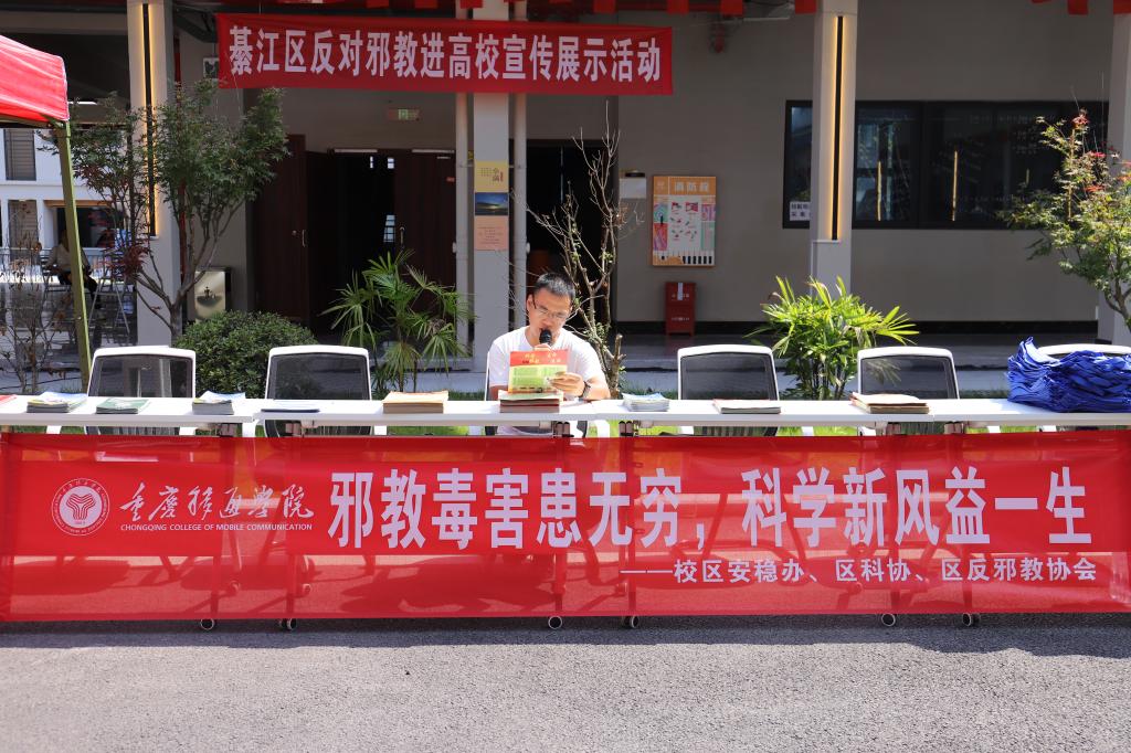 我校采用“线上+线下”方式,前期通过QQ、微信等社交媒体传播有关反邪教知识,从部门组织、书院到年级实现宣传全覆盖,让每位师生远离反邪教“毒害”,将反邪教知识深深刻进“DNA”里。后期在现场活动中,我们通过播放LED大屏、发放DM单、展架等方式宣传,使反邪教意识深入每位移通师生内心。什么是邪教?邪教有哪些危害?我们应该怎样拒绝邪教?綦江区科协、反邪教协会科长熊亚中来到现场,亲身讲解反邪教知识,带领同学们观看展板,解读反邪教视频,是为了师生防范邪教能力的提升,更是对于传播新时代中国特色社会主义思想具有良好的促进作用。