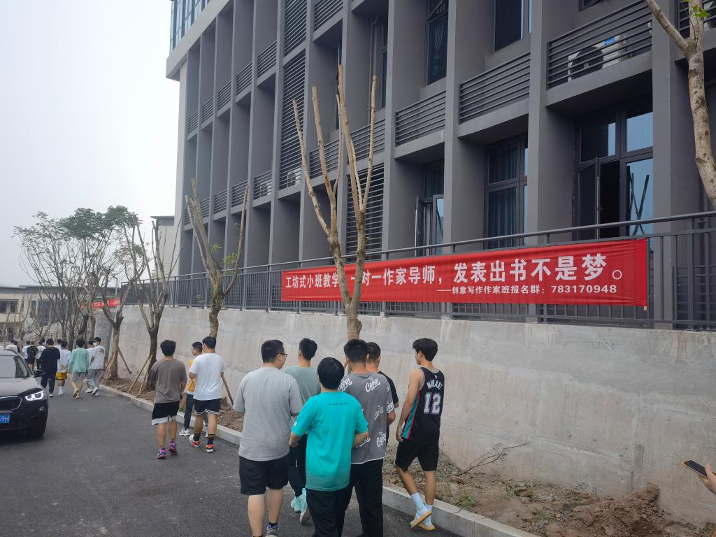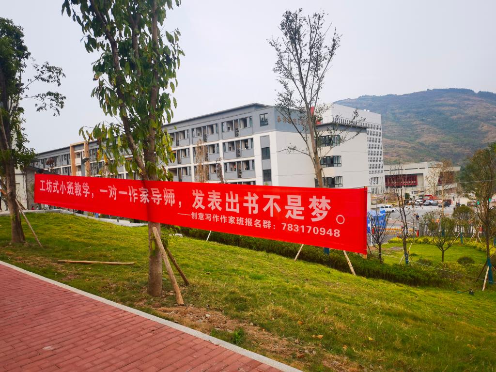 首先,创意写作学院在校领导的大力支持下,将6000份招生宣传册,分别送到了各个学院领导的案头,恳求他们将宣传册分发到各自的学生手上,得到了各位领导的配合。招生组又制作了二十多条横幅和海报,在学校各个显眼位置予以悬挂和张贴,海报和横幅上都有二维码和报名群号。后来,又在各位老师上第一课的课休时间宣讲作家班等,使得长达十天的招生宣传中,报名人数一直稳步上升。