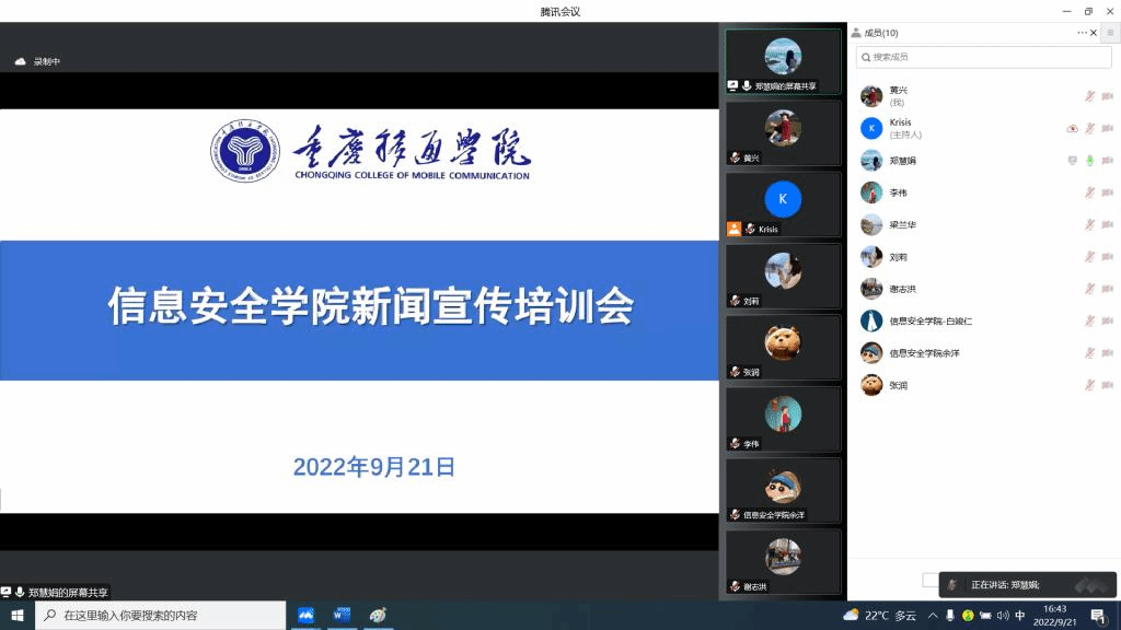 新闻宣传既是服务于学校的中心工作,也是一种没有时空限制、无形的“课堂”和育人渠道、方式的有机延伸。围绕学校的办学理念、人才培养目标定位、校园文化、大学精神等,通过加强新闻宣传工作,面向师生贯彻党的教育方针和政策,使学校的办学、育人理念成为师生共同的精神文化价值目标和追求。9月21日,信息安全学院结合线上线下的方式开展了新闻宣传培训与交流活动,由新闻工作板块负责人郑慧娟老师主讲,全体教职工参加。