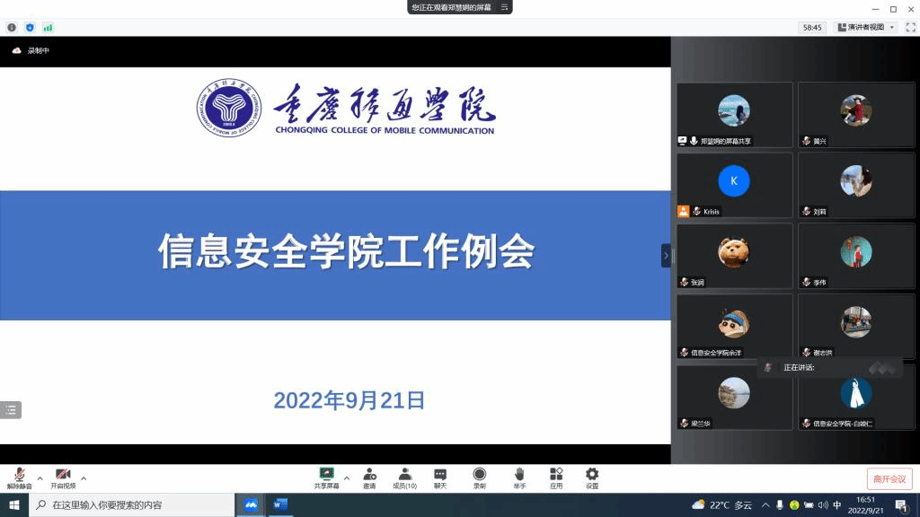半亩方塘一鉴开,天光云影共徘徊。又到了万点黄金,幽香飘十里的金秋,9月21日16:00点,信息安全学院采取线上、线下同步的方式召开了新学期学院工作例会,会议由王陈老师主持。信息安全学院全体教师参加会议。