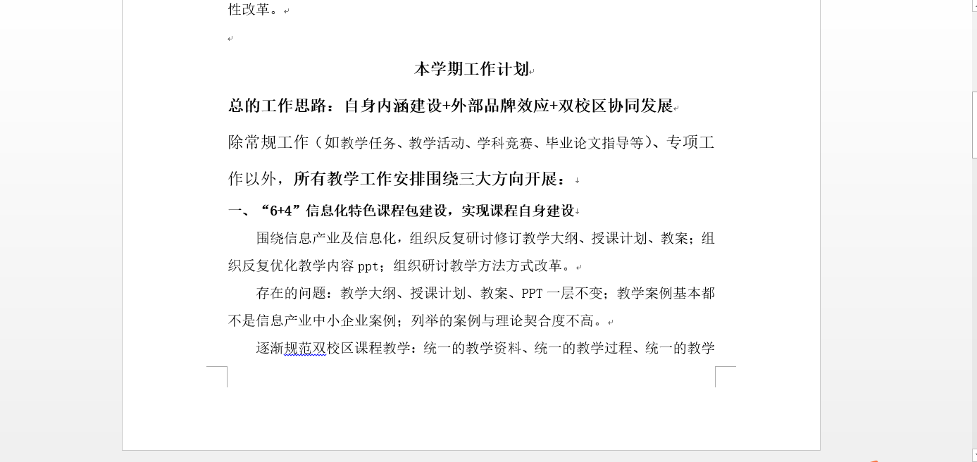 然后,范院长对本学期整体工作计划进行了安排。本学期总的工作思路是:自身内涵建设+外部品牌效应+双校区协同发展。除常规工作、专项工作以外,所有教学工作安排围绕三大方向开展,一是“6+4”信息化特色课程包建设;二是实施信息产业中小企业案例教学;三是启动全校商科实战项目。针对以上建议展开详细部署。